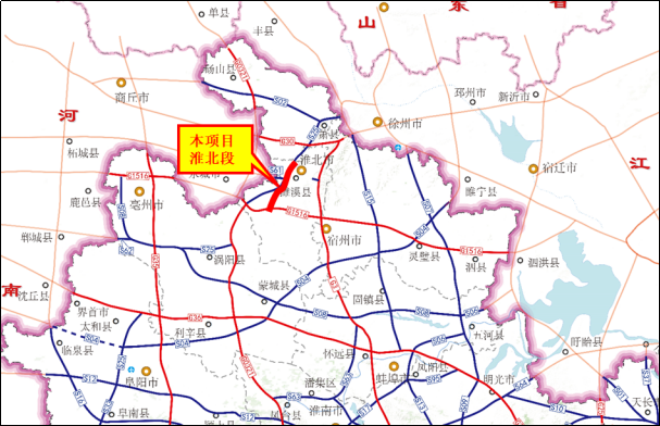 本项目路线全长约72.0公里,其中淮北段路线全长约32.18公里。全线拟按双向四车道技术标准建设,设计速度120公里/小时。全部建设资金约需108.81亿元,其中淮北段建设资金约需48.96亿元。计划2021年底开工建设。