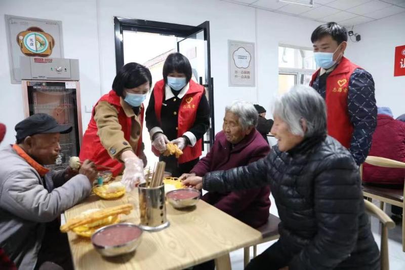3月21日早上,在韩村镇韩村村老年助餐点,志愿者正忙着为前来就餐的老人们端菜送饭,为老人们送来营养美味的早餐,让他们享受着晚年的“幸福味”。