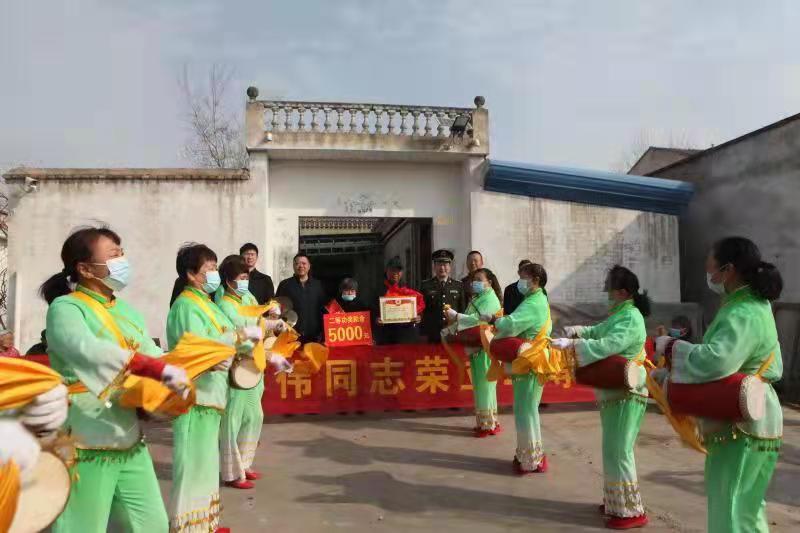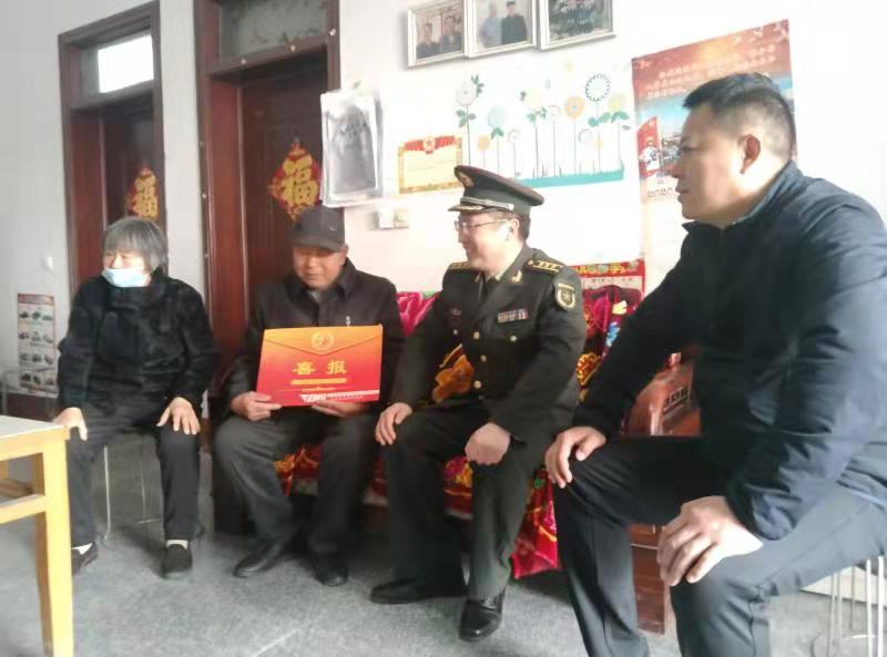 3月10日上午,春风拂面,阳光明媚。在县退役军人事务局的安排组织下,县人武部政委郭兵,县退役军人事务局党组书记、局长秦辉,临涣镇党委副书记、镇长董杨和临涣镇人武部部长等一行带着腰鼓队,到临涣镇临南村毛庄给荣立二等功的现役军人李伟的父母送来了立功喜报及5000元奖励金。据悉,李伟已入伍多年,一直在部队表现十分优秀,多次荣获优秀士兵。尤其他在2021年度工作中成绩突出,荣立二等功。
