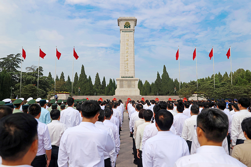 天空高远,松柏苍翠。秋日的双堆集烈士陵园,气氛庄严肃穆。陵园正中央,烈士纪念碑巍然耸立,“淮海战役烈士永垂不朽”十个金色大字在阳光照耀下熠熠生辉。参加仪式的全体人员在纪念碑前整齐列队,垂手肃立。