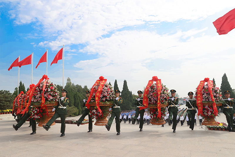 方阵前,9个大型花篮一字排开,红色缎带上“革命烈士永垂不朽”八个大字寄托着对英勇献身革命先烈的深切缅怀和崇高敬意。