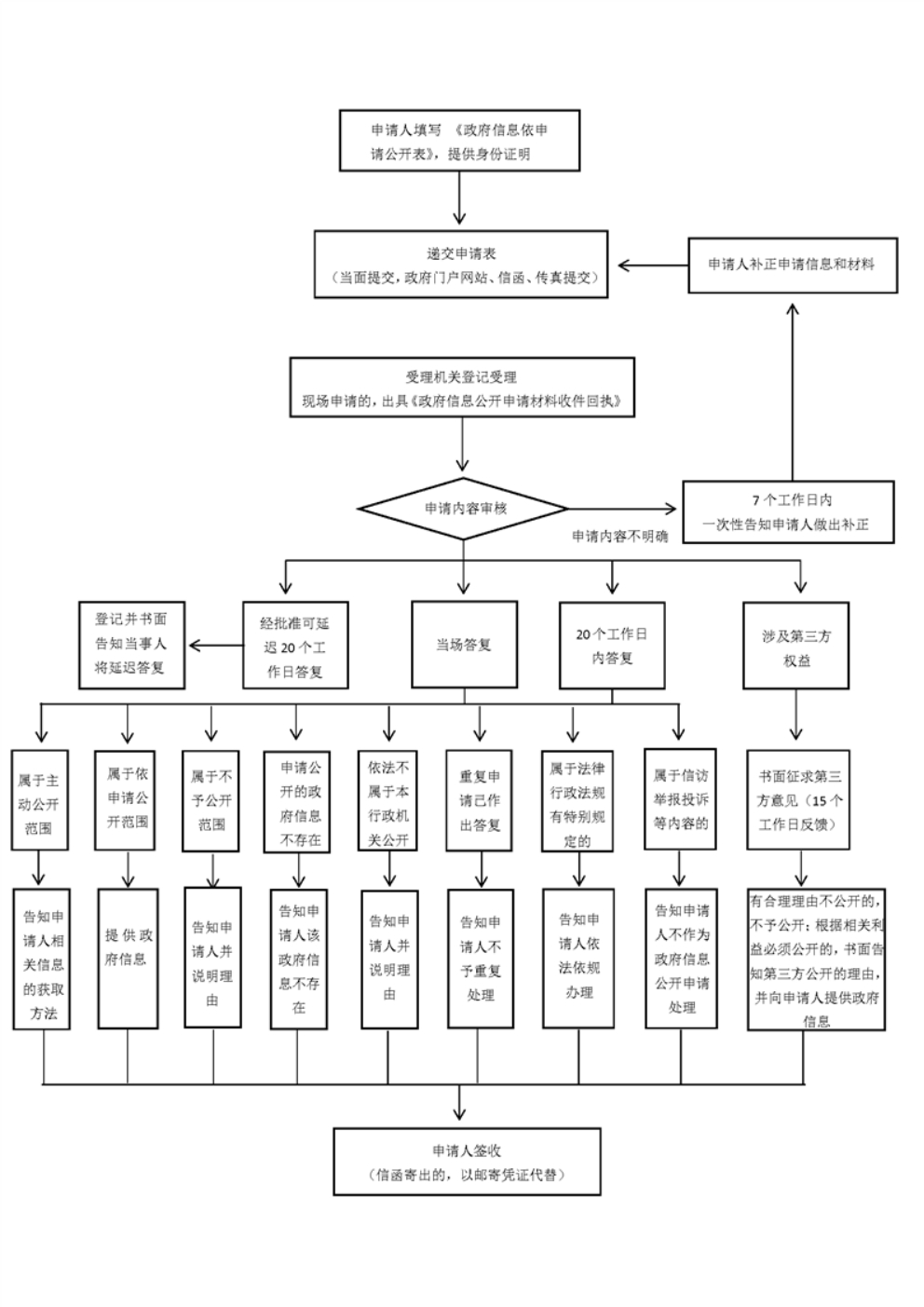 本机关收到申请后,将对申请内容进行审查,政府信息公开申请内容不明确的,要求申请人补正。行政机关收到政府信息公开申请,能够当场答复的,应当当场予以答复。行政机关不能当场答复的,应当自收到申请之日起20个工作日内予以答复;需要延长答复期限的,应当经政府信息公开工作机构负责人同意并告知申请人,延长的期限最长不得超过20个工作日。申请公开的政府信息涉及第三方权益和其他机关的,本机关将征求第三方和其他机关的意见,征求第三方和其他机关意见所需时间不计算在上述规定的期限内。
